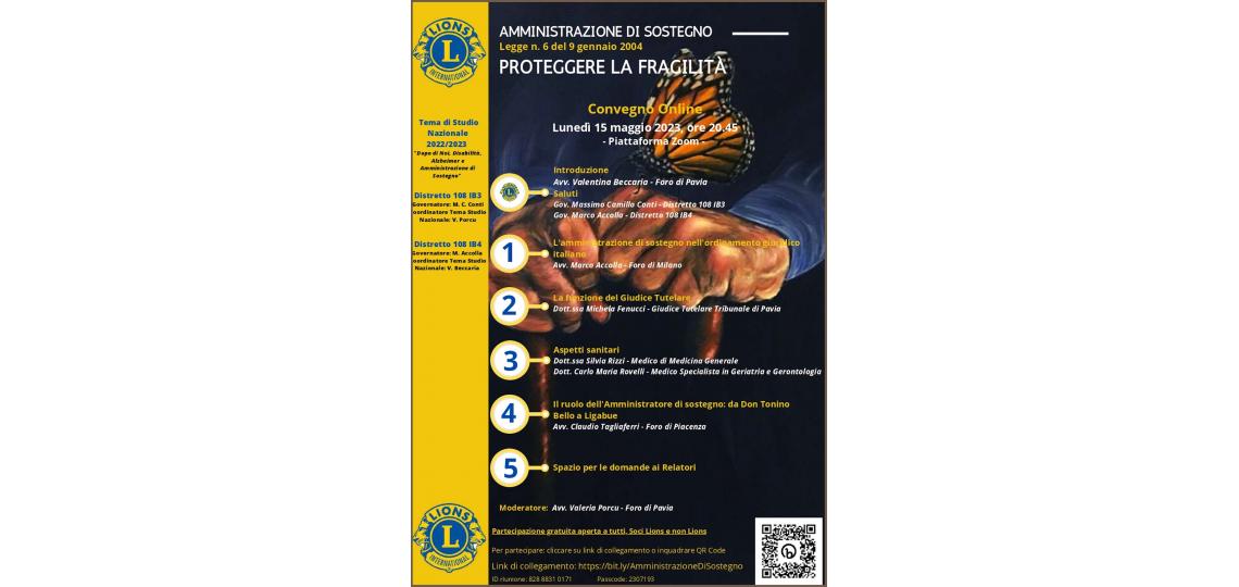 con riferimento al Tema di Studio Nazionale 2022-23, intitolato “Dopo di noi, disabilità, Alzheimer ed amministrazione di sostegno”, si comunica, auspicando una numerosa partecipazione, che lunedì 15 maggio p.v., alle ore 20.45, su piattaforma Zoom, si terrà il Convegno Distrettuale: