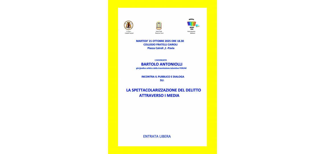 Data Inizio Evento: Martedì, 21 Ottobre, 2025 - 18:30Data Fine Evento: Martedì, 21 Ottobre, 2025 - 20:00Luogo evento: PAVIAOrganizzatore evento: LC PAVIA LE TORRI