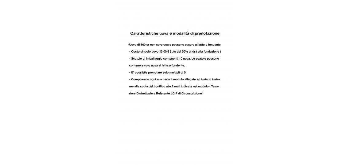 come nostra tradizione il Comitato LCIF del Distretto appena terminate le festività natalizie inizia con la tradizionale vendita delle Uova di Pasqua da 500 gr.