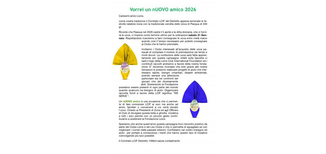 Un nUOVO amico è una occasione che ci permette di fare conoscere LCIF ai soci ma anche ad amici, familiari o conoscenti a cui verrà donato l’uovo.
