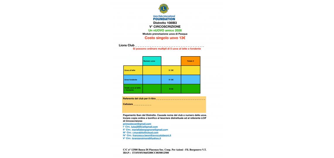 Invitiamo i Clubs interessati all’acquisto delle uova pasquali di compilare il modulo di prenotazione nei tempi e modi dovuti. La confezione delle uova sarà fatta appositamente per questa campagna.